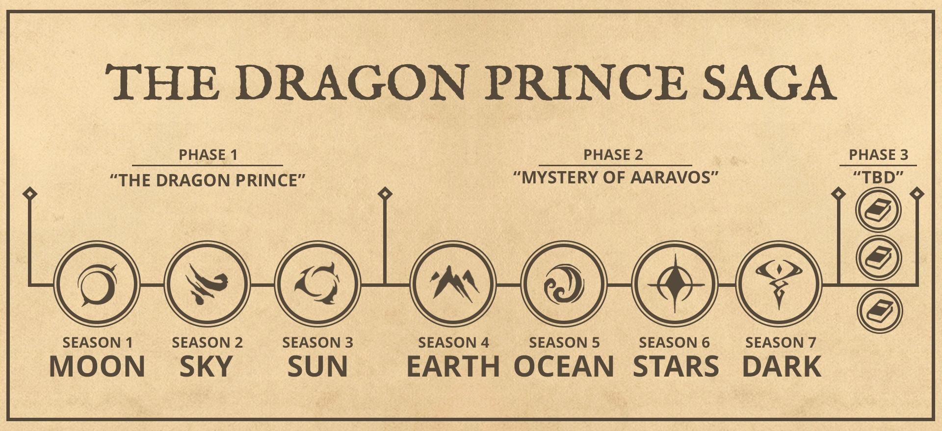 This page contains a list of all canon media in "The Dragon Prince" tying into the story, listed as it appears in Xadia's in-universe timeline. Below, you can find generalized synopses. For more details, please refer to the respective pages.