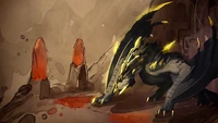 These unnamed Earth Dragons are enormous and powerful dragons with jagged rock-like armor across their head, back, and tail, with gold gemlike spikes at selective spots. They have two forward-facing bull-like horns and a pair of large wyvern-like wings located on the backside of their arms. They live in underground caverns and only emerge once a century. They are capable of burrowing through the ground at high speeds and can blast a powerful wave of volcanic ash from their mouths.[6]