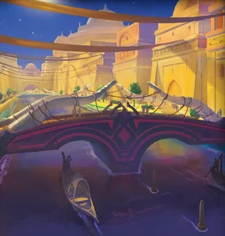 Eboreus lies in the northern desert lands of Neolandia, cut off from the rest of the kingdom by a large river. A port city designed in the image of an elephant's tusk, its main waterway is covered by bridges, and canals fork off the river. It is also the hub of Neolandia's internal and domestic trade.[4] It is currently the only known city of the kingdom.
